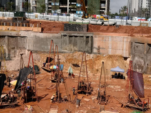 拟建建筑场地现已开挖基坑,基坑深约5~6m,场地超前钻钻孔高程在79.24~81.11m之间,相对高差1.87m。根据超前钻的勘探情况,参建各方在组织召开项目现场协调会后,桩型拟定为摩擦桩,桩端以破碎石灰岩、较破碎石灰岩、较完整石灰岩作为桩端持力层。当以破碎石灰岩、较破碎石灰岩、较完整石灰岩作为桩端持力层时,桩径为1200mm的桩长进入破碎石灰岩、较破碎石灰岩、较完整石灰岩层的厚度合计加起来不少于28m。本次施工勘察主要查明桩端以下不少于6m范围内的石灰岩是否存在溶洞及软弱夹层。