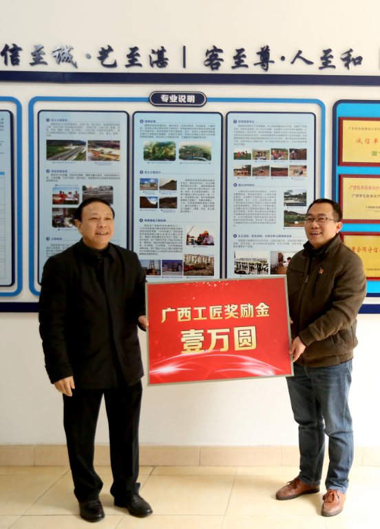 我队正高级工程师翁敦贤获得2021年“广西工匠”荣誉称号,在岩土工程和区域地质调查与研究等领域颇有建树。唐善茂亲自把“广西工匠奖励金壹万圆”送到翁敦贤手中,对他获得2021年“广西工匠”荣誉称号表示衷心祝贺,并勉励他要做好技术成果的转化和引领工作,要进一步挖掘和整合技术成果,把专业技术转化为推动单位发展和转型的生产力;在立足专业深研细钻的基础上,做到“人无我有,人有我精,人精我专,人专我转”,确保始终以创新力引领行业进步;要发挥工匠精神带出工匠团队,让工匠精神在本单位蔚然成风,让匠心追梦技能报国的使命扛在每一位职工的肩上,并记在心上、落在行动上。