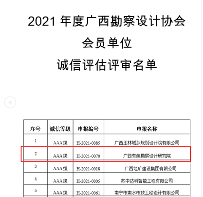 近日,广西勘察设计协会开展了2021年度广西勘察设计协会会员单位诚信评估。经协会审核、专家认定,我院获评了广西勘察设计协会AAA级诚信单位。