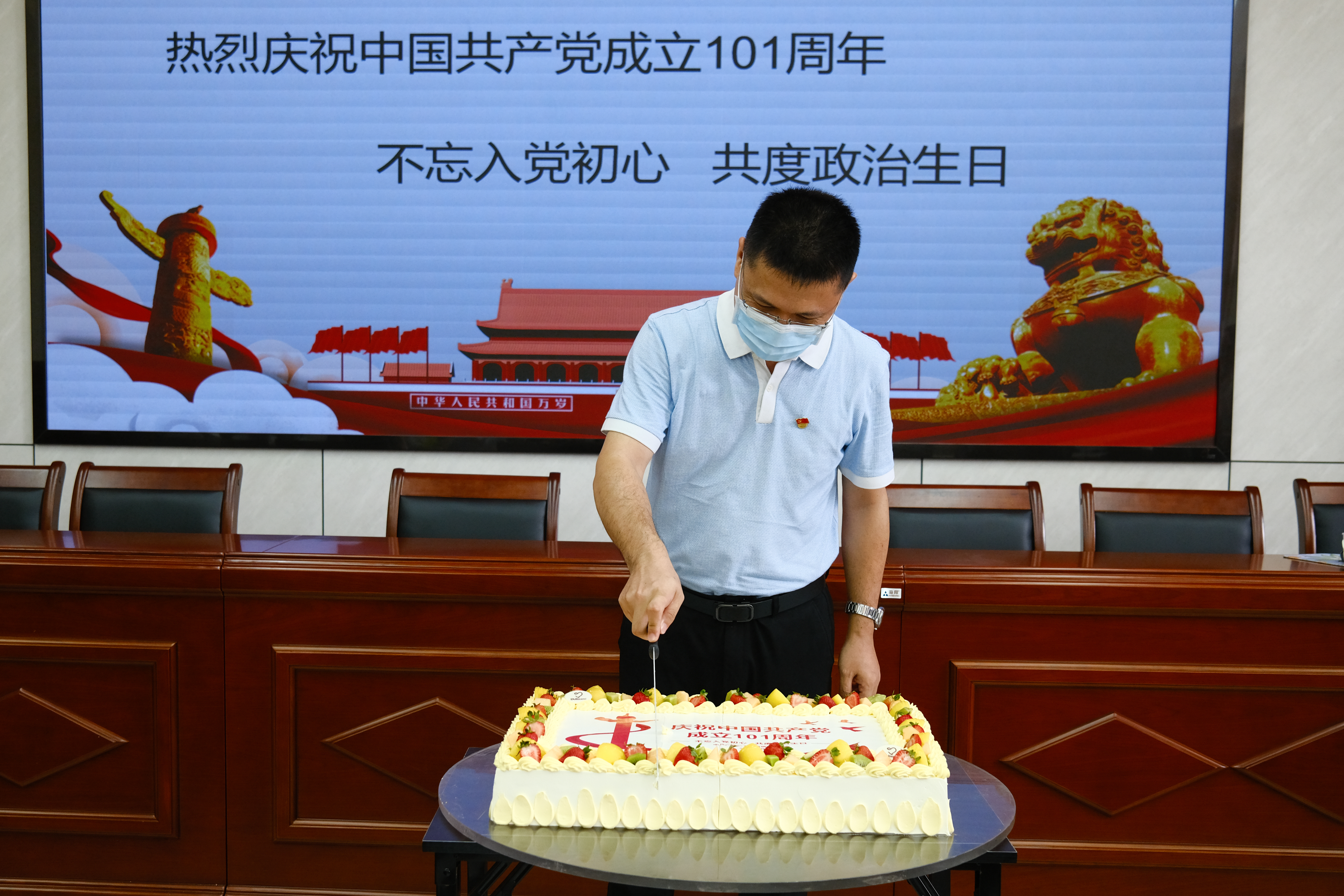 大会还为全体党员过集体政治生日,我队党委书记翁敦贤同志为大家送上了诚挚祝福,希望党员同志们继续践行入党誓词,注重党性修养,增强党员意识,永葆党员的先进本色,用理想和信仰绘制地质队发展的新蓝图,以智慧和汗水书写中国新未来。