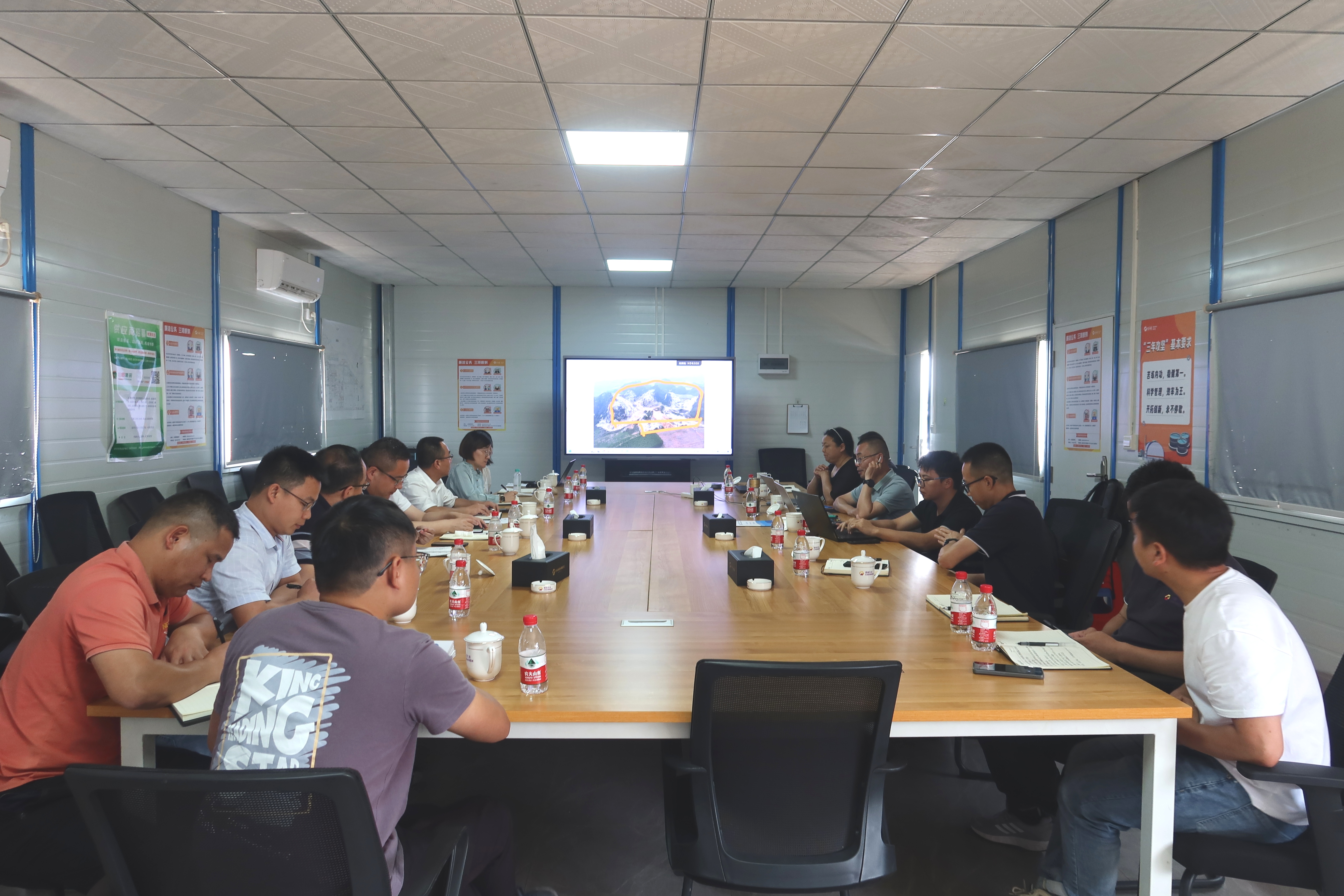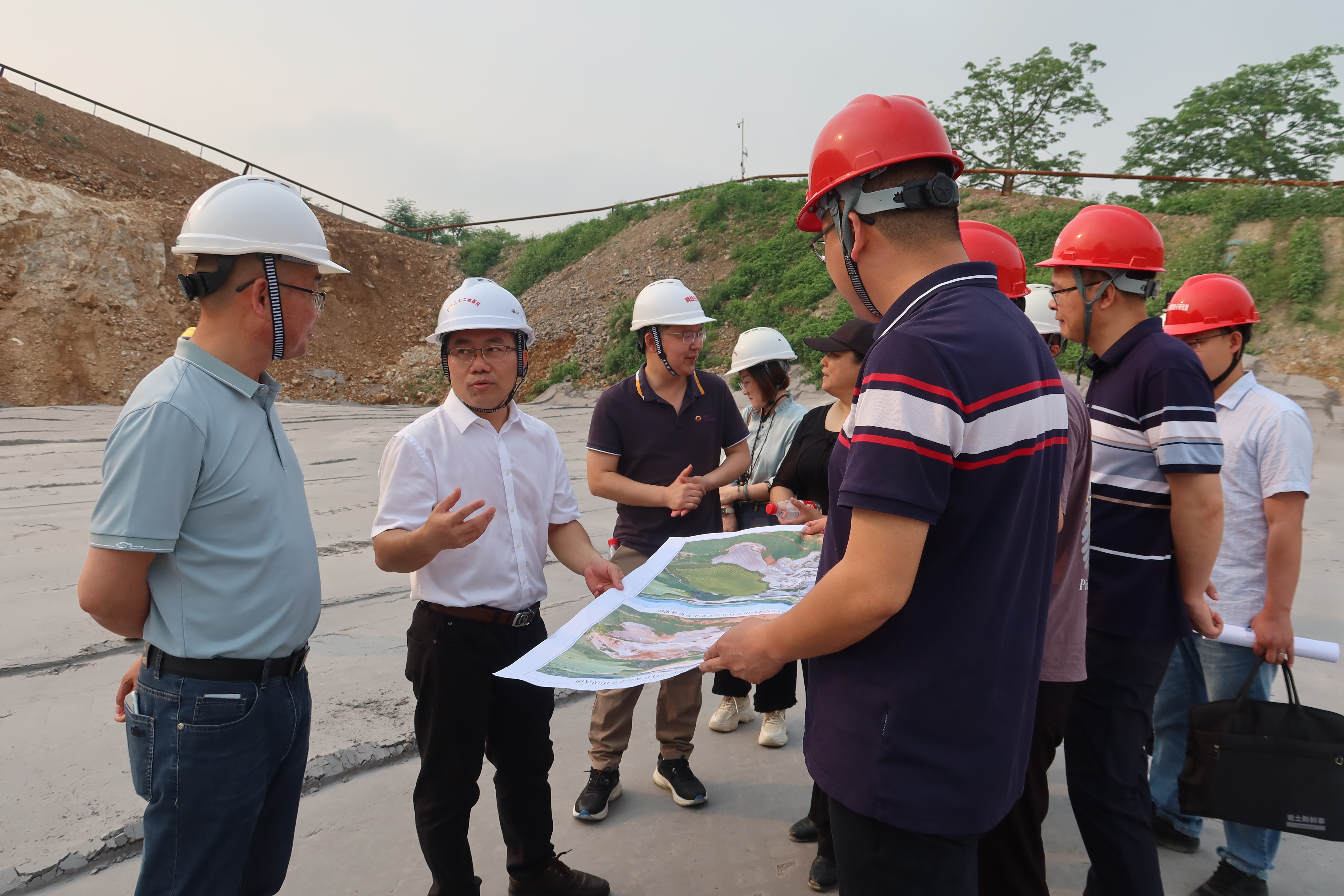 我院首先参观了鹏越公司的扶绥县渠旧镇岜河排栏山新石灰矿矿山地质环境保护与土地复垦(一期)项目,该项目位于扶绥县西南方,经过多年采矿,形成巨大采矿坑,鹏越公司采用了自主研发的创新型石膏凝胶材料进行了填埋修复治理,既实现了广西磷化工企业可持续高质量发展,又充分契合了广西的废弃遗留矿山生态修复治理的理念。我院详细了解了该公司的石膏凝胶材料的研发、使用、优势等方面,充分学习了该公司科技成果转化应用的成功经验,有效激发了我院的创新热情与动力。