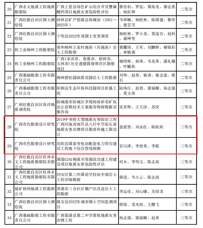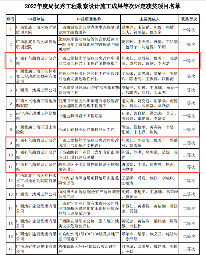 本网讯(罗梦莹 报道)近日,我院6个项目荣获2023年度自治区地矿局优秀工程勘察设计施工成果,其中《广西工业技术学院危旧房改住房项目二期工程岩土工程详细勘察报告》获得一等次;《广西工业技师学院危旧房改住房改造项目二期基坑支护设计》、《丁当碳酸钙产业园(含配套矿山和港口)项目地形测量》、《临桂地区不明金属物体探测和挖掘服务项目》获得二等次;《2019中央特大型地质灾害防治工程广西河池市南丹县八圩中学泥石流地质灾害治理项目勘查和施工图设计》、《宾阳县国泰变电站配套电力管沟建设工程地下综合管线探测》获得三等次。(编辑:张白雪;校对:廖德好;审核:翁敦贤)