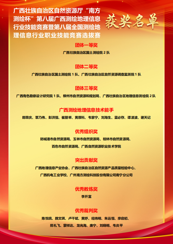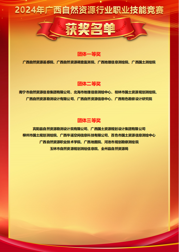 本网讯(尹军 报道)近日,我院荣获2024年广西自然资源行业职业技能竞赛团体二等奖,黄泽平、周晨两位同志荣获了个人三等奖。荣获广西壮族自治区自然资源厅“南方测绘杯”第八届广西测绘地理信息行业技能竞赛暨第八届全国测绘地理信息行业职业技能竞赛选拔赛团体三等奖,韦家宁、蓝必存两位同志荣获了广西测绘地理信息技术能手称号,有力展现了我院技术人员扎实的专业技能。(编辑:张白雪;校对:廖德好;审核:翁敦贤)