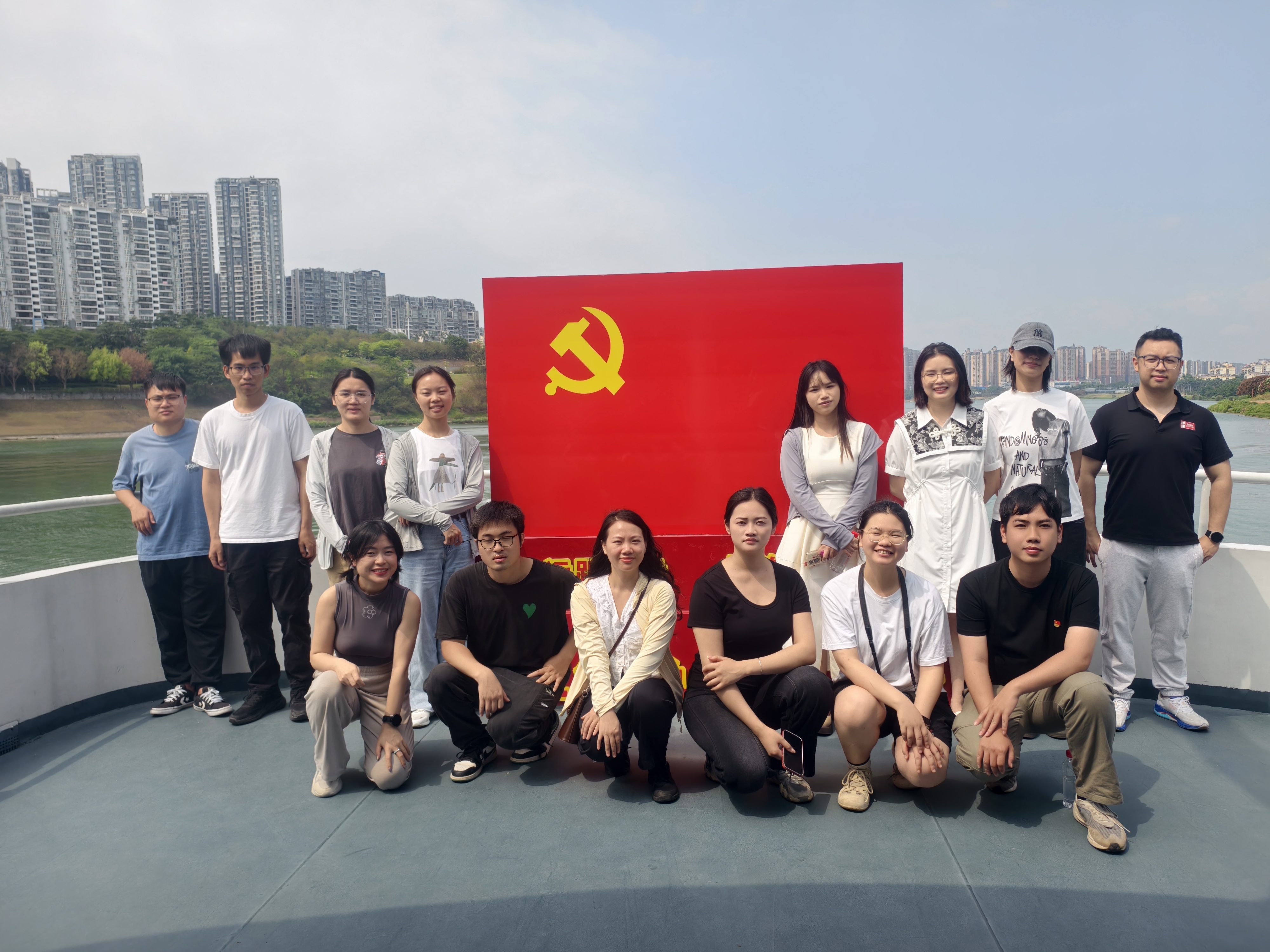 全体团员在民生旅游码头的邕字碑进行了合照,随后所有人员有序登船,先在一层船舱会议室进行了红船起航仪式,聆听了邕江红船历史,进行了入团宣誓,以坚定有力的声音许下青春誓言。